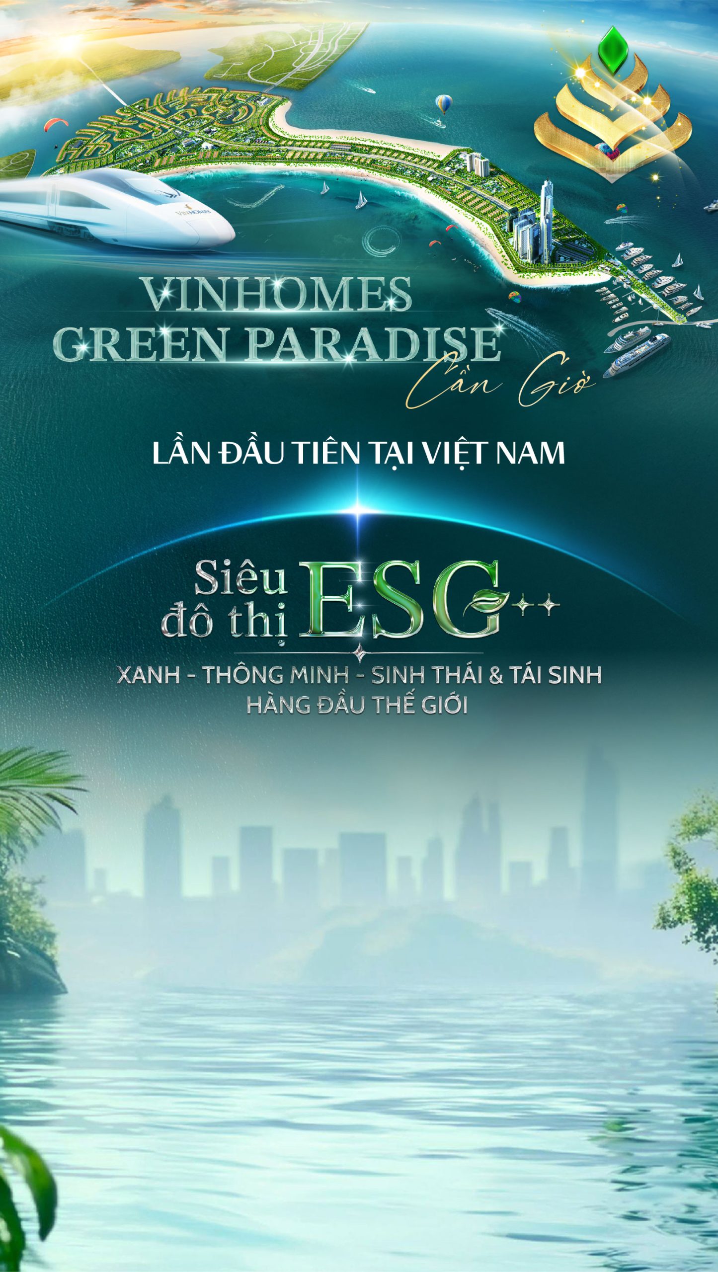 Vinhomes Green Paradise Cần Giờ vận hành theo mô hình ESG++ đầu tiên tại Việt Nam – chuẩn phát triển xanh, thông minh và tái sinh hệ sinh thái. Dự án hướng tới cộng đồng cư dân hạnh phúc, khỏe mạnh, công bằng và văn minh.