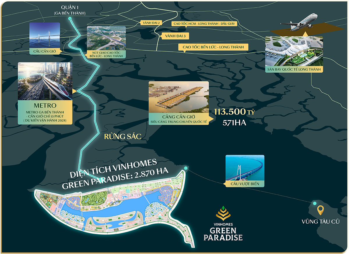 Dự án hưởng lợi trực tiếp từ hạ tầng chiến lược như cầu Cần Giờ, metro và xu hướng sống xanh – nghỉ dưỡng của giới thượng lưu,